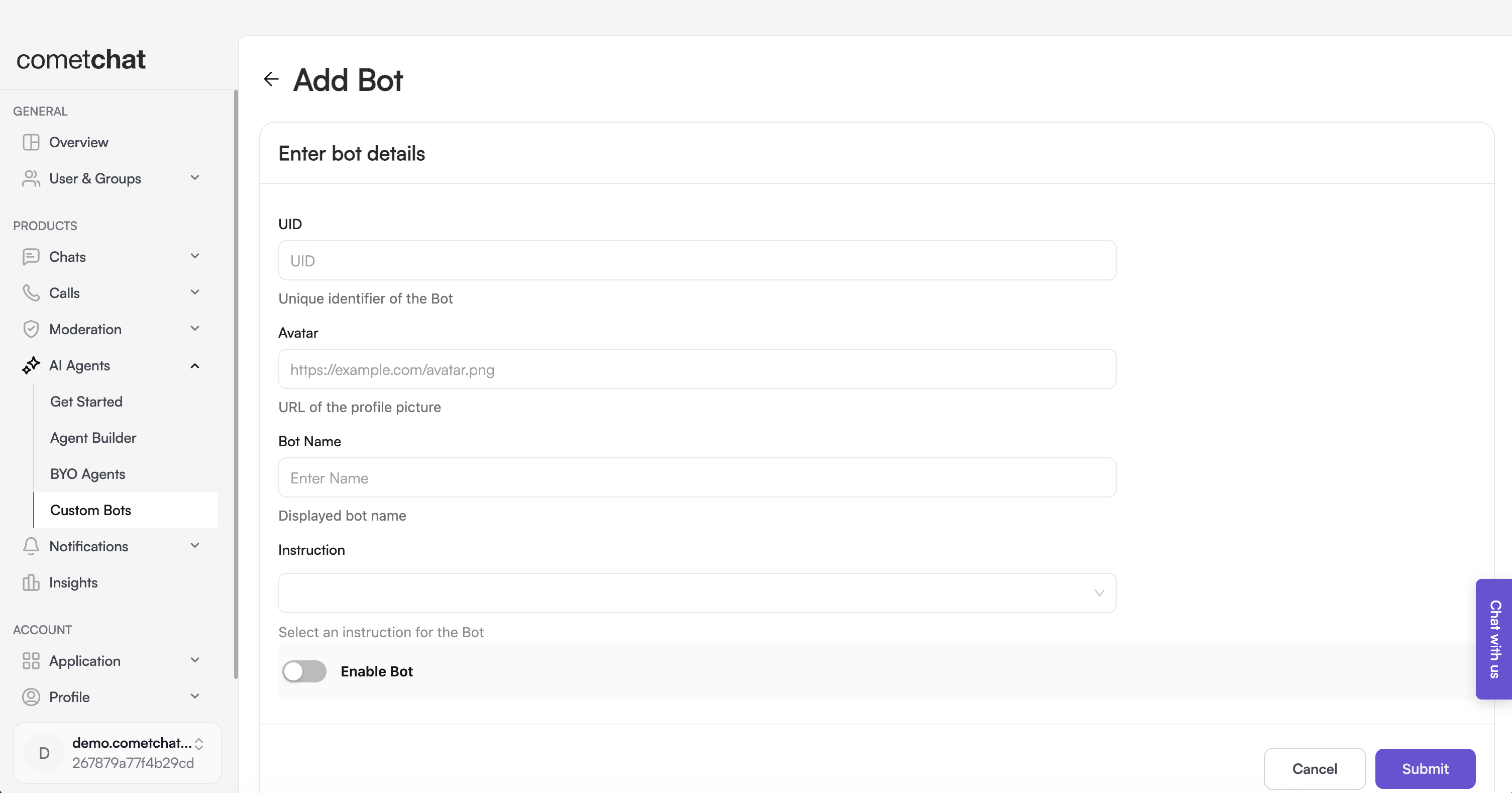 - Navigate to AI Agents > Custom Bots > AI Bots in the left-hand menu.