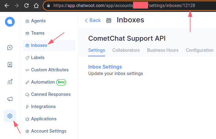 https://app.chatwoot.com/app/accounts/123/settings/inboxes/12128then the Inbox ID is12128.