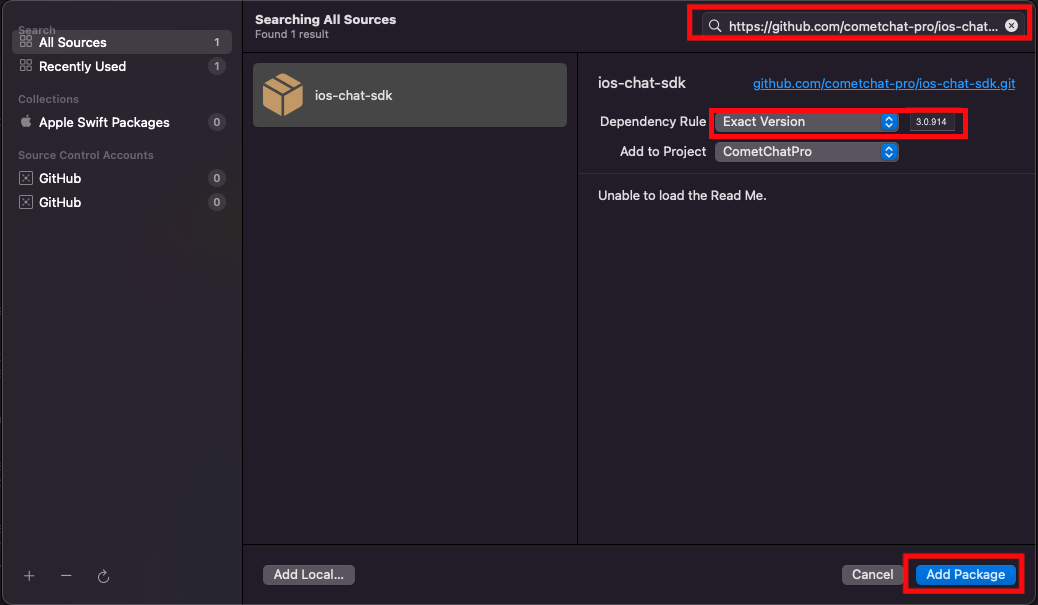 1. Once the pop-up appears, enter the github repository address in the search bar https://github.com/cometchat/chat-sdk-ios.git and set dependency rule to Up to Next Major Version and set version as 3.0.919 . Then click on the Add Package button.