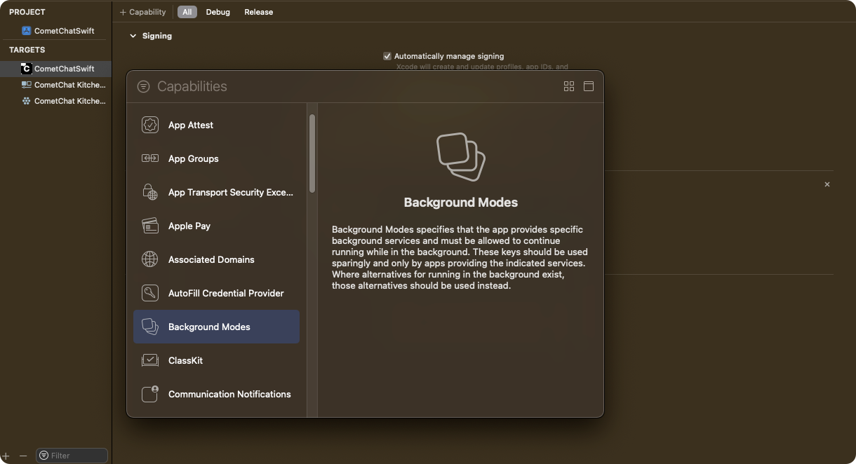 Click on Targets -> Project -> [+ Capability] -> Add ‘Background Modes’ section.