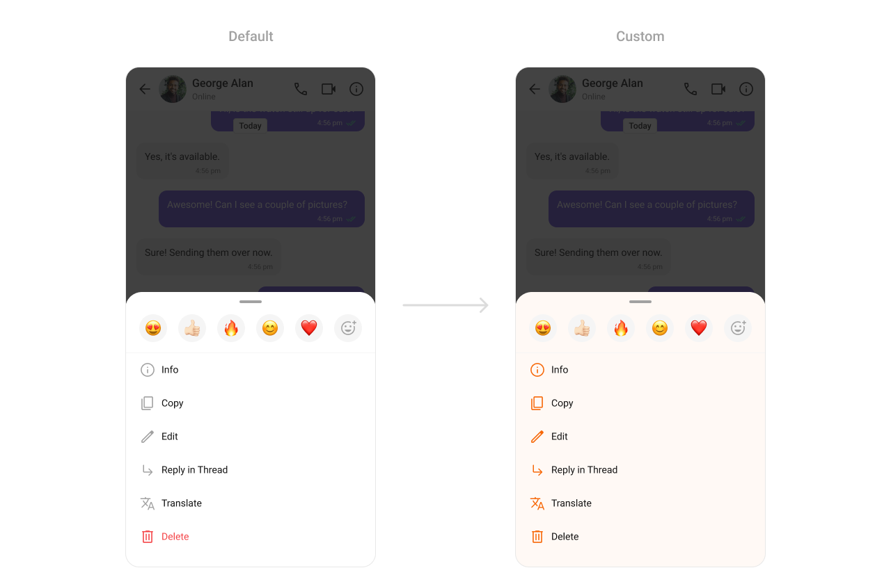 TheCometChatMessageOptionSheet Component is a context menu for performing actions on messages, such as replying, forwarding, or deleting. Developers can style its background, icons, and text to match the app’s menu system.