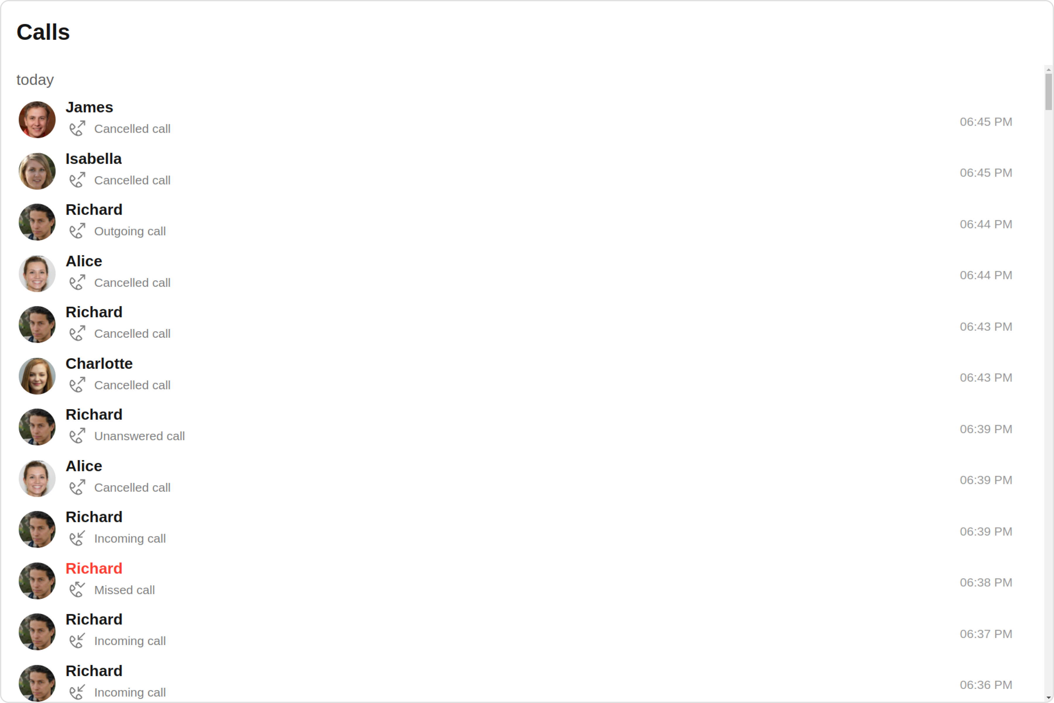 | missedCallIconTint | Used to set missed call icon tint | missedCallIconTint?: string; |