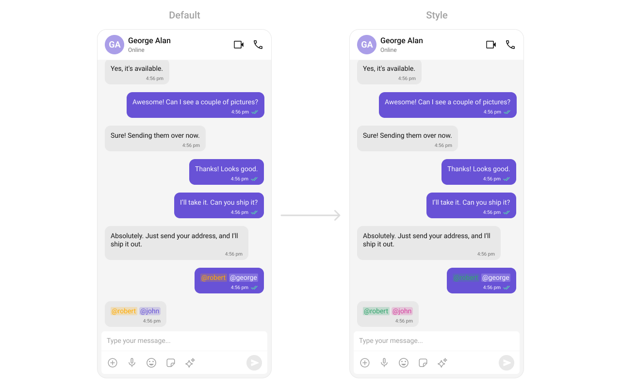 To fit your app’s design requirements, you can customize the appearance of the conversation component. We provide exposed methods that allow you to modify the experience and behavior according to your specific needs.Style