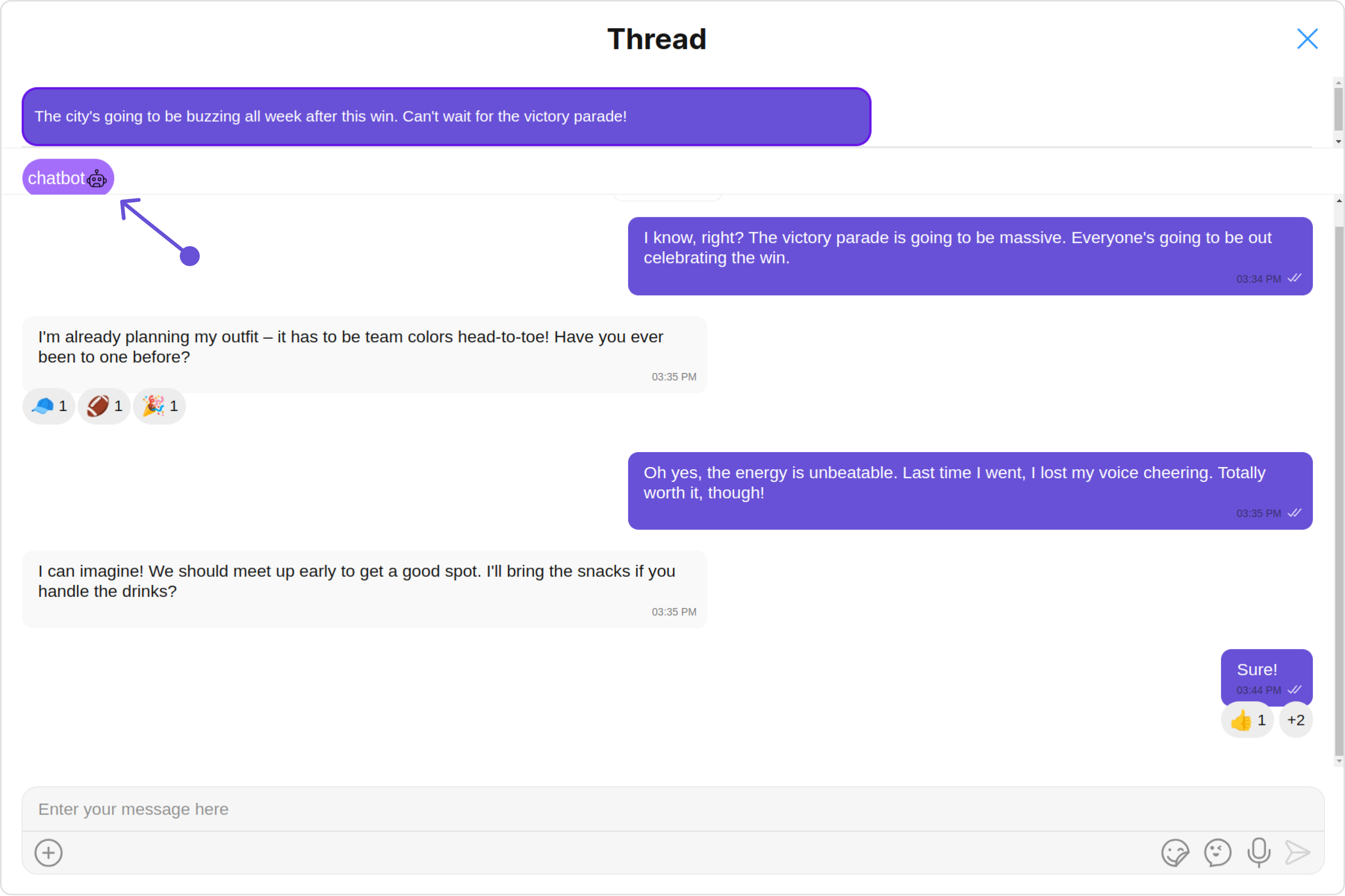 The following code snippet illustrates how you can directly incorporate the ThreadedMessages component into your Application.- ThreadedMessagesDemo.tsx